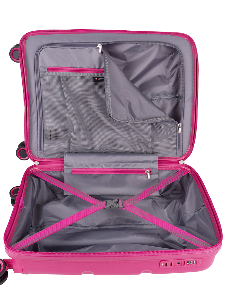 Sleek, striking, and super-functional – the unique new Cellini Cruze Collection in vibrant Cabaret Pink, Ceramic Turquoise, and Midnight Black with colour-matched trims interior zips, and elastic tie-down straps add an element of playful excitement as you jet off to your travel destination. Move this durable hardshell case easily with the 4 double-wheel Cellini-branded system and feel secure with the integrated TSA lock and 10-year warranty.