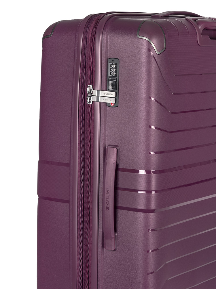 This Large 4-Wheel Trolley case is spacious with an expander feature to allow you to take all you need for that much-needed vacation. The interior is fitted with a zipped separator and additional zipped sections to keep all your belongings safely in place during the journey. The 4 colour-coordinated wheels offer smooth mobility and the integrated TSA lock ensures security and peace of mind. The hardshell Cellini Guardlite collection in Black and Mauve is manufactured using durable, versatile and water-resistant Polypropylene which is also lightweight, eco-friendly and offers excellent impact resistance