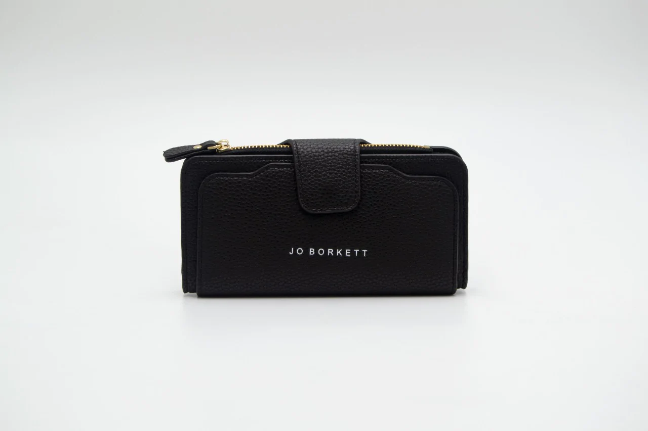 Faux lether surface embossed logo + printed wallet with gold hardware.